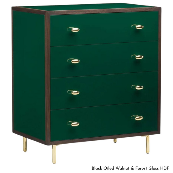 | Material Notes | Natural colour and grain variations in every plank make each piece an individual. Traditional wood joinery bonded with wood glue ensures structural integrity. All finishes are non-toxic and applied by hand, sprayed or rubbed. Drawer interiors are made from basswood, a blond timber with outstanding stability in varying climates, ensuring a smooth-running function. Drawers are detailed with dovetail joinery and a soft-close mechanism. Legs and drawer pulls in polished bronze. |
