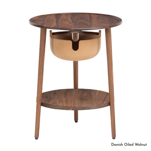 De La Espada Companions Bedside, available in two heights, is constructed in solid wood with a beautiful wedge tenon detail on the top, and a removable cork bowl hanging below as storage for private bits.