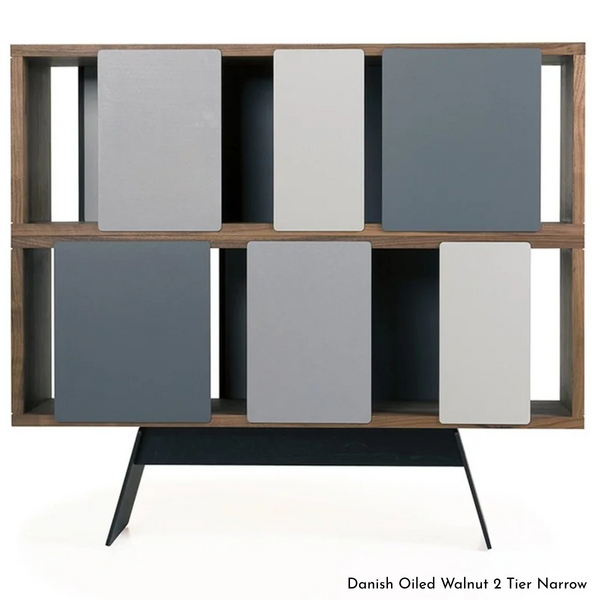 | Material Notes | Natural colour and grain variations in every plank make each piece an individual. Traditional wood joinery bonded with wood glue ensures structural integrity. All finishes are non-toxic and applied by hand, sprayed or rubbed. Matte black painted steel legs. Comes with three doors per shelf, consisting of one of each door size, placed along one side of the cabinet only. These doors can be easily removed and reattached on the other side of the cabinet and/or on any tier if preferred. |