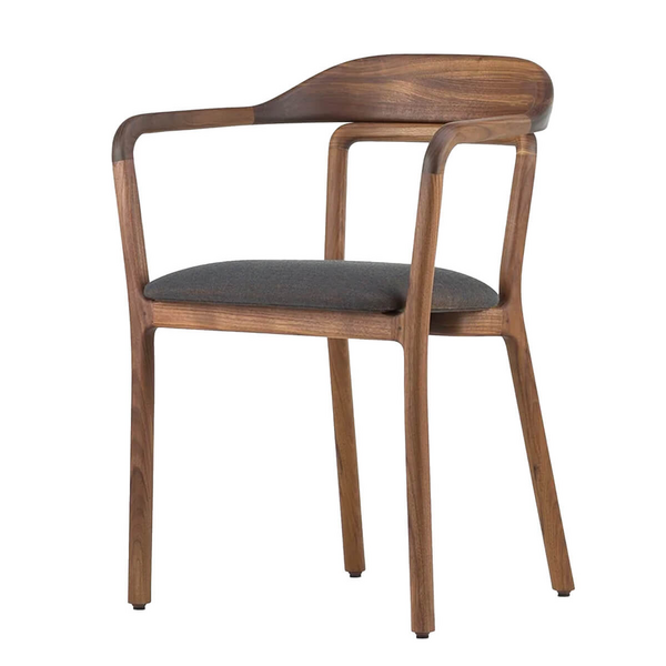 Though it echoes the elegance of steam-bent wood, Duet is meticulously constructed from individual carved components, joined with traditional mortise and tenon techniques. This allows for continuous, fluid curves while proudly revealing subtle join lines and the rich grain variation of solid walnut. The Canvas 764 upholstered seat introduces a soft, tactile element to the design, a cool-toned grey with multi-tonal depth that quietly complements the warmth of the timber.