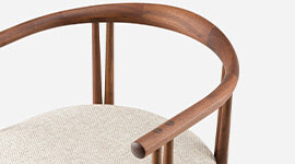 Crafted from solid hardwood — including black walnut, white oak, or European ash — each chair reflects the rich tonal variation and character of its material. The timber is finished by hand in a range of natural or stained finishes, offering flexibility to suit diverse interior styles. The seat can be upholstered in a selection of luxurious fabrics or leathers, further elevating the chair’s tactile appeal and customizability.