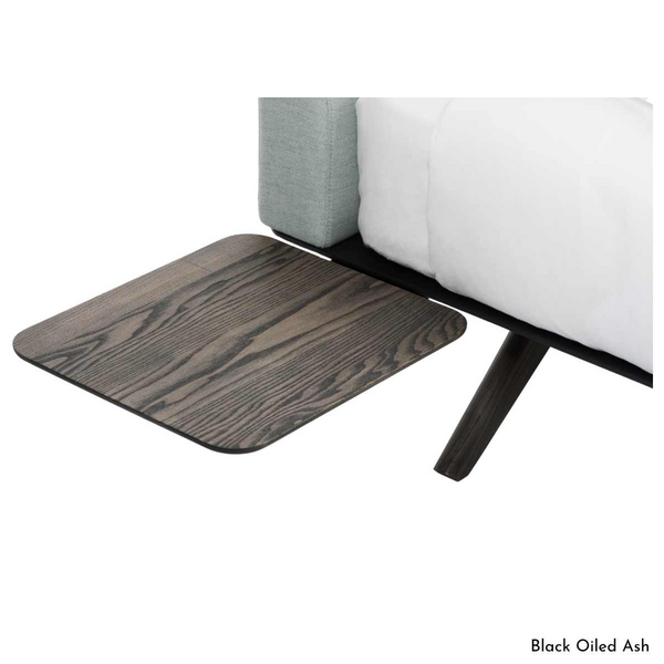 The De La Espada Hepburn Side Table is a solid wood table that connects intuitively to the underside of the De La Espada Hepburn bed on the right or left hand side. The slender surface 'floats' above the floor, maintaining the levity of the Hepburn Bed while providing essential bedtime storage.