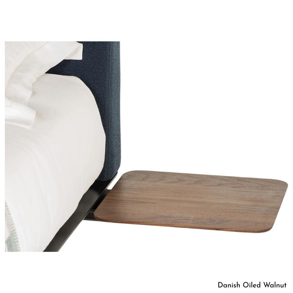 The De La Espada Hepburn Side Table is a solid wood table that connects intuitively to the underside of the De La Espada Hepburn bed on the right or left hand side. The slender surface 'floats' above the floor, maintaining the levity of the Hepburn Bed while providing essential bedtime storage.