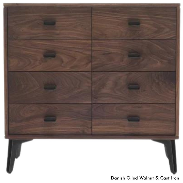 | Material Notes | Natural colour and grain variations in every plank make each piece an individual. Traditional wood joinery bonded with wood glue ensures structural integrity. All finishes are non-toxic and applied by hand, sprayed or rubbed. Each drawer face made from a single plank of timber. Drawer interiors are made from basswood, a blond timber with outstanding stability in varying climates, ensuring a smooth-running function. Drawers are detailed with dovetail joinery and a soft-close mechanism. Drawer handles and legs made from cast iron. |