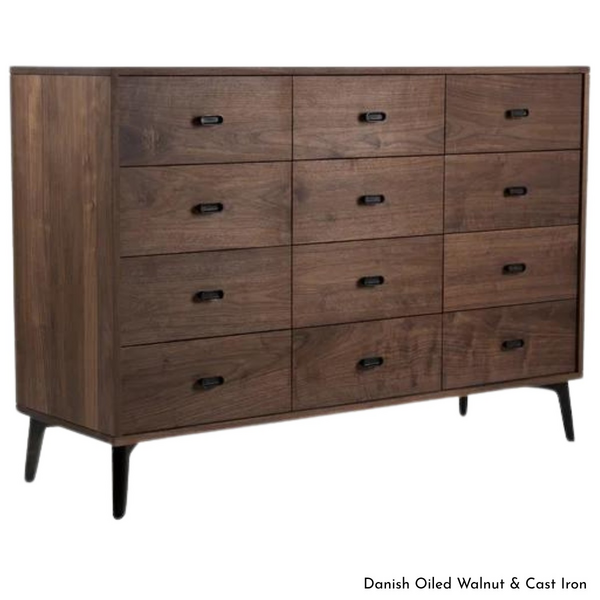 | Material Notes | Natural colour and grain variations in every plank make each piece an individual. Traditional wood joinery bonded with wood glue ensures structural integrity. All finishes are non-toxic and applied by hand, sprayed or rubbed. Each drawer face made from a single plank of timber. Drawer interiors are made from basswood, a blond timber with outstanding stability in varying climates, ensuring a smooth-running function. Drawers are detailed with dovetail joinery and a soft-close mechanism. Drawer handles and legs made with cast iron. |