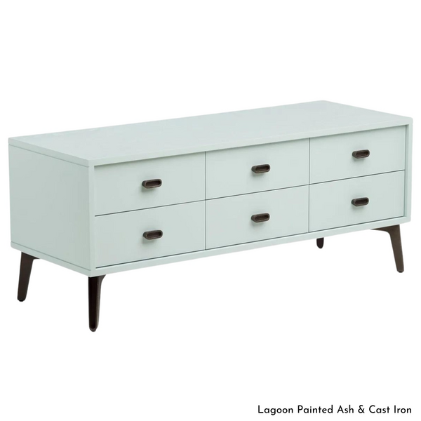 | Material Notes | Natural colour and grain variations in every plank make each piece an individual. Traditional wood joinery bonded with wood glue ensures structural integrity. All finishes are non-toxic and applied by hand, sprayed or rubbed. Each drawer face made from a single plank of timber. Drawer interiors are made from basswood, a blond timber with outstanding stability in varying climates, ensuring a smooth-running function. Drawers are detailed with dovetail joinery and a soft-close mechanism. Drawer handles and legs made from cast iron. |