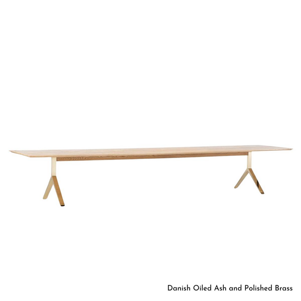 De La Espada Overton Table is named after the town in West Yorkshire, England, a county that inspires Matthew Hilton, with its rugged landscape and history of producing modernist sculptors. Every plank in the solid wood tabletop features beautiful joinery which Hilton devised for the CNC machine, allowing for greater table lengths, no longer bound by the height of the tree. The hardwood top is complemented by the cleverly engineered metal leg frame, and the metal detailing running through the centre of the tabletop.