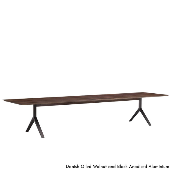De La Espada Overton Table is named after the town in West Yorkshire, England, a county that inspires Matthew Hilton, with its rugged landscape and history of producing modernist sculptors. Every plank in the solid wood tabletop features beautiful joinery which Hilton devised for the CNC machine, allowing for greater table lengths, no longer bound by the height of the tree. The hardwood top is complemented by the cleverly engineered metal leg frame, and the metal detailing running through the centre of the tabletop.