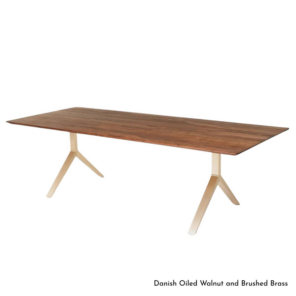 De La Espada Overton Table is named after the town in West Yorkshire, England, a county that inspires Matthew Hilton, with its rugged landscape and history of producing modernist sculptors. Every plank in the solid wood tabletop features beautiful joinery which Hilton devised for the CNC machine, allowing for greater table lengths, no longer bound by the height of the tree. The hardwood top is complemented by the cleverly engineered metal leg frame, and the metal detailing running through the centre of the tabletop.