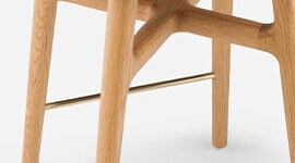 Expertly handcrafted in Portugal, the Solo Bar Stool showcases meticulous attention to detail and timeless materiality. It is available in a selection of premium solid timbers, including American black walnut, American white oak, and European ash. Each timber is finished to highlight its natural grain, with options that include oiled, stained, oxidised, or painted treatments to suit a variety of interiors. The stool’s sophisticated aesthetic is further enhanced by a brushed brass cross bar, delivering a subtle yet luxurious accent.