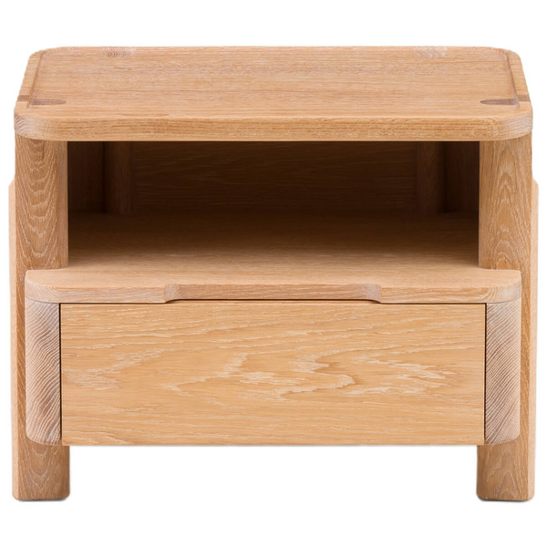 Functionally versatile, the bedside chest offers generous yet compact storage with one soft-close drawer and an open shelf, making it ideal for keeping bedside essentials neatly organized. Thoughtful design features include recessed drawer handles that stay discreet yet easy to use, integrated cable management for modern devices, and a recessed tabletop edge that prevents items from rolling off.
