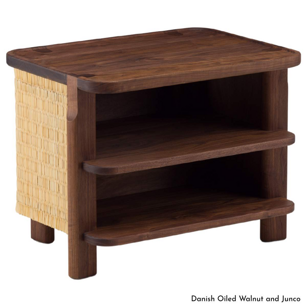 Exemplifying meticulous attention to detail, the De La Espada Twenty-Five Bedside Table is a harmonious blend of tradition and modernity, designed to elegantly accompany the Twenty-Five Bed. Each side panel, masterfully woven at the venerable Toino Abel workshop in Portugal, is secured with magnets to a solid timber frame, revealing generous storage with discreet cable management. The table's design, featuring a subtle recess to cradle your cherished items and sophisticated joinery, marries functionality with an understated aesthetic.