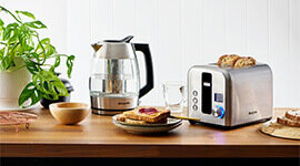 Styled in matching finishes, the toaster and kettle bring cohesion to your kitchen. Both feature compact footprints, cord storage, and ergonomic designs—making the bundle as stylish as it is functional.