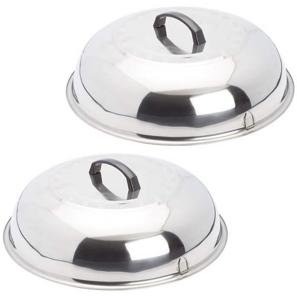 | Features | Versatile Set of Two: Includes 16" and 13" stainless steel covers for a variety of cooking tasks, from steaming to melting. Durable Stainless Steel Construction: Resistant to rust, corrosion, and high heat, ensuring long-lasting performance. Domed Design for Heat Circulation: Promotes even cooking and efficient steaming, perfect for locking in moisture and flavour. Ergonomic Handles: Easy-to-grip handles for safe, convenient handling during high-heat cooking sessions. |