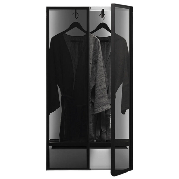 Bathroom cabinet unit with double hinged door, bathrobe hook and inner drawer, width 80cm, height 150cm, depth 35cm. Furniture finished internally and externally. Doors with matt black painted aluminium frame and dark grey glass. Shelves with matt black painted aluminium frame and dark grey glass.