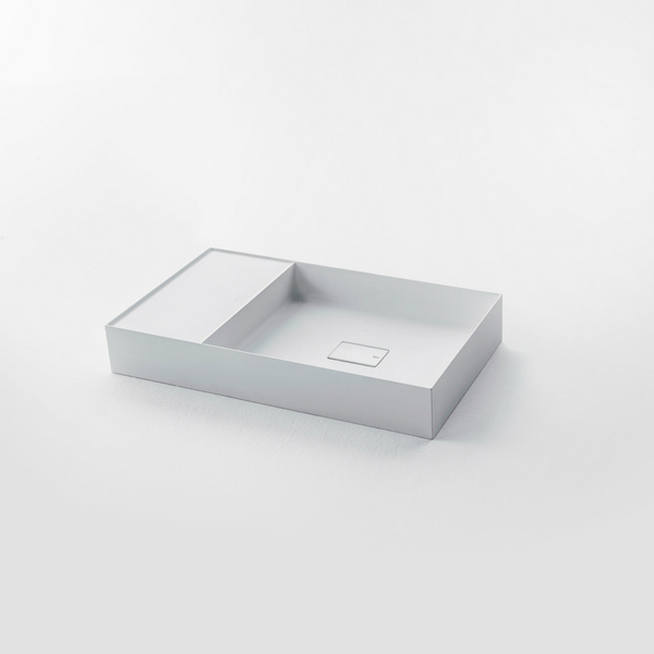 The Falper Quattro Zero 800mm Basin with Side Countertop redefines a visual perception of lightness in the bathroom. Made from matt white Ceramilux, an engineered composite, the basin achieves a 4mm thin profile, top with drip edging and 45 degree finish, and features a functional side countertop. The basin is reversible, allowing for either left or right placement of the countertop and can be wall hung or bench mounted. If installing this basin as a stand-alone wall hung unit it will require a fixing kit and towel rail (sold separately). The basin is offered with a matching free-flow waste, comes with no tap holes and requires the use of wall mount tapware.