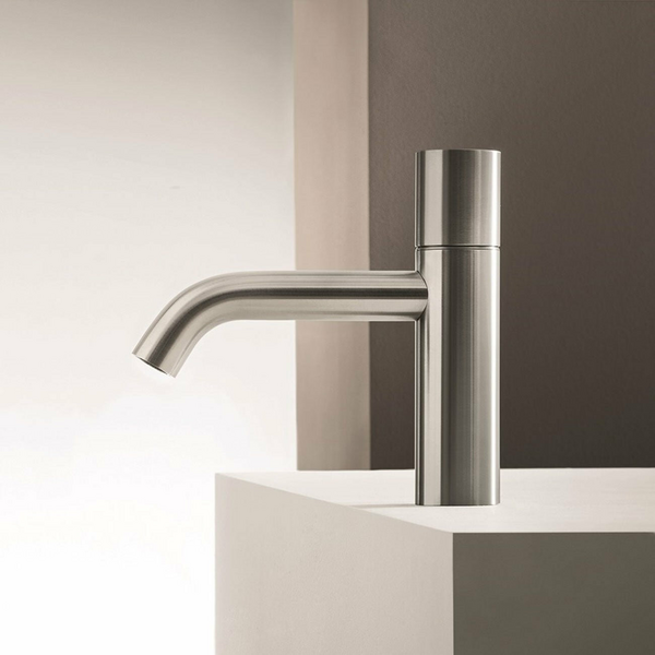 The cylindrical handle is an extension of the mixer body and lifts upwards to open, like a lever. Presented in the highest quality brushed Stainless Steel, the mixer is perfectly suited to a contemporary bathroom.