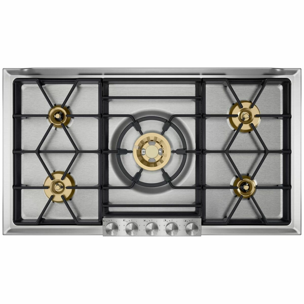 Each burner is mechanically regulated to offer nine exact power levels, ensuring precise and reproducible flame sizes every time. The control panel is designed for comfortable and secure operation, making it easy to adjust settings as needed. Solid, smooth-surface cast pan supports provide stability and durability, while the multi-ring brass burners deliver consistent heat, just like in a professional kitchen. Elevate your cooking experience with this high-performance, stylish cooktop.