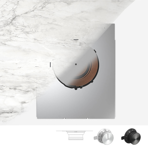 The cooktop operates using an enhanced surface protector, which not only activates the induction zones but also protects the worktop from scratches. A subtle, intuitive central light links to the control knob, changing its intensity to signal the zone’s status—whether it's in use, cooling down, or requires the surface protector. Once your cooking is complete, the light switches off, leaving your kitchen with a smooth, uninterrupted work surface that’s as functional as it is stylish.