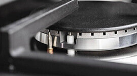 Durable cast iron trivets offer stable cookware support and long-lasting strength. The flat, secure trivet design enhances safety while maintaining a streamlined appearance. Electronic ignition is conveniently controlled through the knobs, allowing quick and reliable burner start-up without the need for external ignition devices.