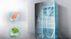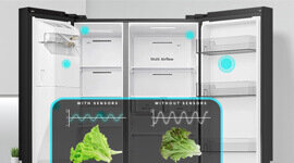 Integrated digital sensors monitor conditions throughout the fridge and freezer, enabling the inverter compressor to respond precisely and maintain optimal cooling with greater efficiency.