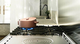 The Nostalgie gas cooktops boast high-quality cast-iron pan supports and solid brass burners for durability and precision. With an advanced nanotechnology coating, the burners are not only non-stick but also resistant to fire, ensuring a long-lasting, easy-clean surface. Whether you're a passionate homecook or a culinary enthusiast, this series combines beauty and performance in a way that honours tradition while embracing modern convenience. Available in various sizes and setups, the Nostalgie cooktops bring timeless elegance to any kitchen.