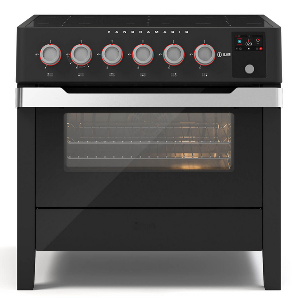 The ILVE Panoramagic Single Electric Oven with Induction Cooktop combines Italian design finesse with top-tier performance. At 90 cm, this range cooker offers six induction cooking zones, providing the precision and flexibility needed for everything from gentle simmering to intense searing. The iconic tilted control panel, with its large LED-backlit knobs and signature front handle, delivers both style and ease of use, making it a striking yet practical addition to any modern kitchen.