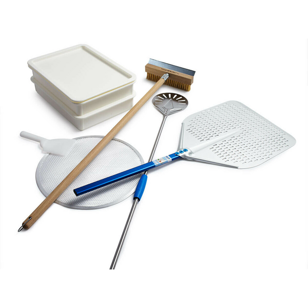 | Features | 16-inch perforated rectangular peel ● Used to transfer assembled pizza from the oven● The same version used by Neapolitan pizza masters ● Perforated design reduces the amount of flour on the bottom of the dough while allowing the pie to slide off easily ● Aluminum construction ● Made in Italy 6-inch articulated peel ● Used when rotating pizza in the oven and to pull the pizza from the oven● Sliding grip to make it easy to rotate and manipulate pies ● Stainless steel construction ● Made in Italy Push-broom style brass cleaning brush with stainless steel scraper ● Clean your hot cooking deck with this long-handled brass brush● Brass bristles clean the deck and pull crumbs to the tray of the Artisan Fire Pizza oven ● Scraper removes burnt cheese or other trouble spots Stacking dough boxes ● Store dough while rising or resting● Scaled-down version of the boxes restaurants use to keep individual dough balls ready for use ● Hold a dozen 10-ounce dough balls ● Included dough scraper for splitting and lifting dough without bruising ● Two boxes, 18 x 26 x 3.5 inches each, plus lid ● Made in USA 16-inch aluminum pizza screen ● Slide under the pizza in the oven when you want to slow down the browning of the crust |