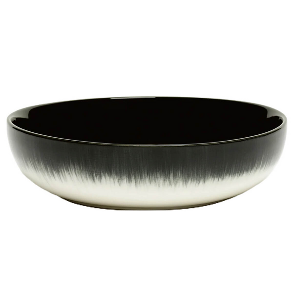 The High plates - a deep, flat bowl shape - add versatility to the refined Dé dining experience. The black and white collection is available in multiple variations of the fine, black feathering pattern. The Dé collection of tableware features Chiaroscuro, the play of light and shadow that is characteristic of Ann Demeulemeester’s style. Plates are edged with a dégradé, painted by hand in several layers so that each one is unique.