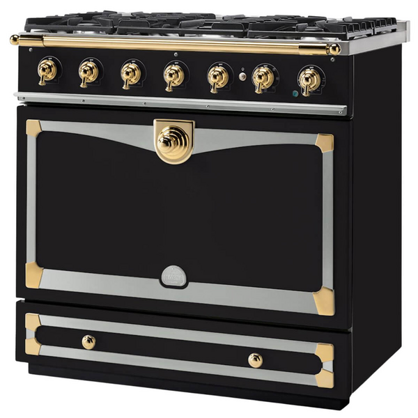 La Cornue Albertine 90cm Dual Fuel Freestanding Oven Matte Black with Polished Brass ALB90DFMB-BN