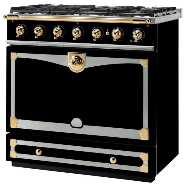 La Cornue Albertine 90cm Dual Fuel Freestanding Oven Shiny Black with Polished Brass ALB90DFBL-BN