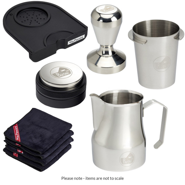 A comprehensive accessories pack from la Pavoni to get your home cafe started – it features a 51mm stainless steel tamper for achieving the correct tamping pressure, a 51mm Coffee Distributor to evenly smooth out the coffee, and a stainless steel milk frothing jug. The Tamper Mat is designed to hold the tamper or portafilter while tamping to avoid any drips, the Dosage Cup is for safe transfer of ground coffee to the portafilter and lastly there are four microfibre cloths to help keep the steam wand clean or to wipe up spills.