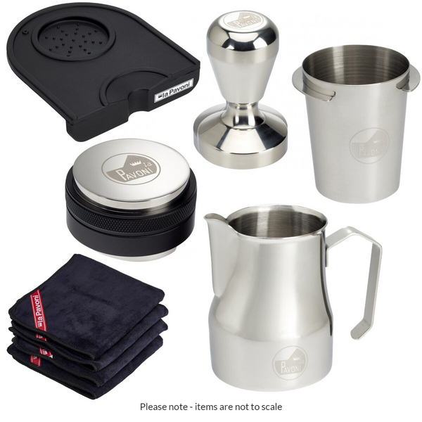 A comprehensive accessories pack from la Pavoni to get your home cafe started – it features a 58mm stainless steel tamper for achieving the correct tamping pressure, a 58mm Coffee Distributor to evenly smooth out the coffee, and a stainless steel milk frothing jug. The Tamper Mat is designed to hold the tamper or portafilter while tamping to avoid any drips, the Dosage Cup is for safe transfer of ground coffee to the portafilter and lastly there are four microfibre cloths to help keep the steam wand clean or to wipe up spills.