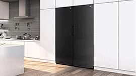 The upright design and non-protruding door allow it to easily fit next to cabinets and the sleek matte black finish will make it a perfect fit for any modern kitchen.