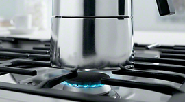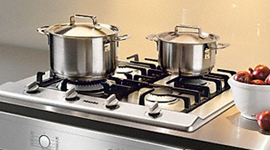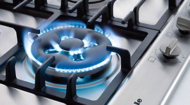 This Miele cooktop features the GasStop safety system. Using thermo-electric flame failure monitors, the appliance will automatically stop the gas supply when the flame is accidentally extinguished.