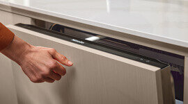 Experience the magic of Miele with Knock2open, ideal for handleless kitchen designs. Simply tap the front of the fully integrated Miele dishwasher twice, and the door automatically opens. This innovative feature adds a touch of convenience to your daily routine, making dishwashing effortlessly elegant.