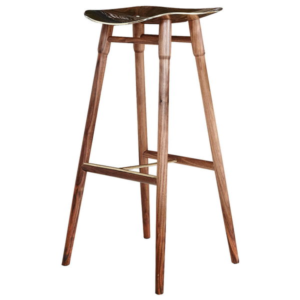 The solid brass seat is available in a polished or black anodized option which creates a striking contrast to the timber legs. Inspired by the way brass is used in architecture as a point of human contact, it invites touch and gains warmth and depth through a natural patina over time.