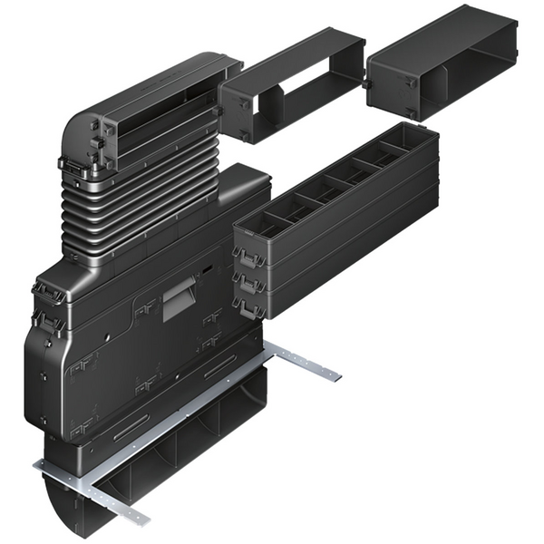 Optimized for quick and flexible installation in all common furnitures (Minimum plinth height: 100mm) Includes: 3 horizontal adapter elements (40mm, 80mm, 120mm) for worktop depths from 600mm to 750mm, upper 90° diverter element, flexible telescopic element (for additional height, depth and lateral adjustability), 4 height adapter elements (50mm each) for furniture corpus heights from 675mm to 900mm, housing element for cleanAir filter drawer casette (optionally 180° reversible), cleanAir high performance odor filters, lower 90° diverter with air outlet (optionally 180° reversible), adaptve air diffusor element, element for fixation onto bottom panel of furniture. The cleanAir high performance odor filter is specifically optimized for all cooking applications and has an odor reduction rate of 85% and a lifetime of approximately 1 year.