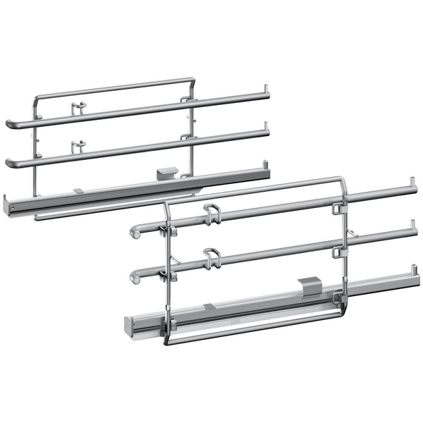 One pair of telescopic rails and frames to refit an oven with standard grids with ComfortFlex Rail Systes with the telescopic rails the accessories can be pulled out of the oven without tipping over