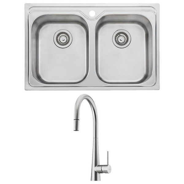 Oliveri Sonetto Double Bowl Sink and Essente Pull Out Tap Pack SS31625SN63TU