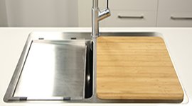 Sonetto sinks are compatible with a variety of accessories, transforming them into multi-purpose food preparation areas for your kitchen. Basket wastes can catch food particles before they go down the drain, and drainer trays or bamboo chopping boards that neatly fit over the sink bowls can provide additional kitchen work space.