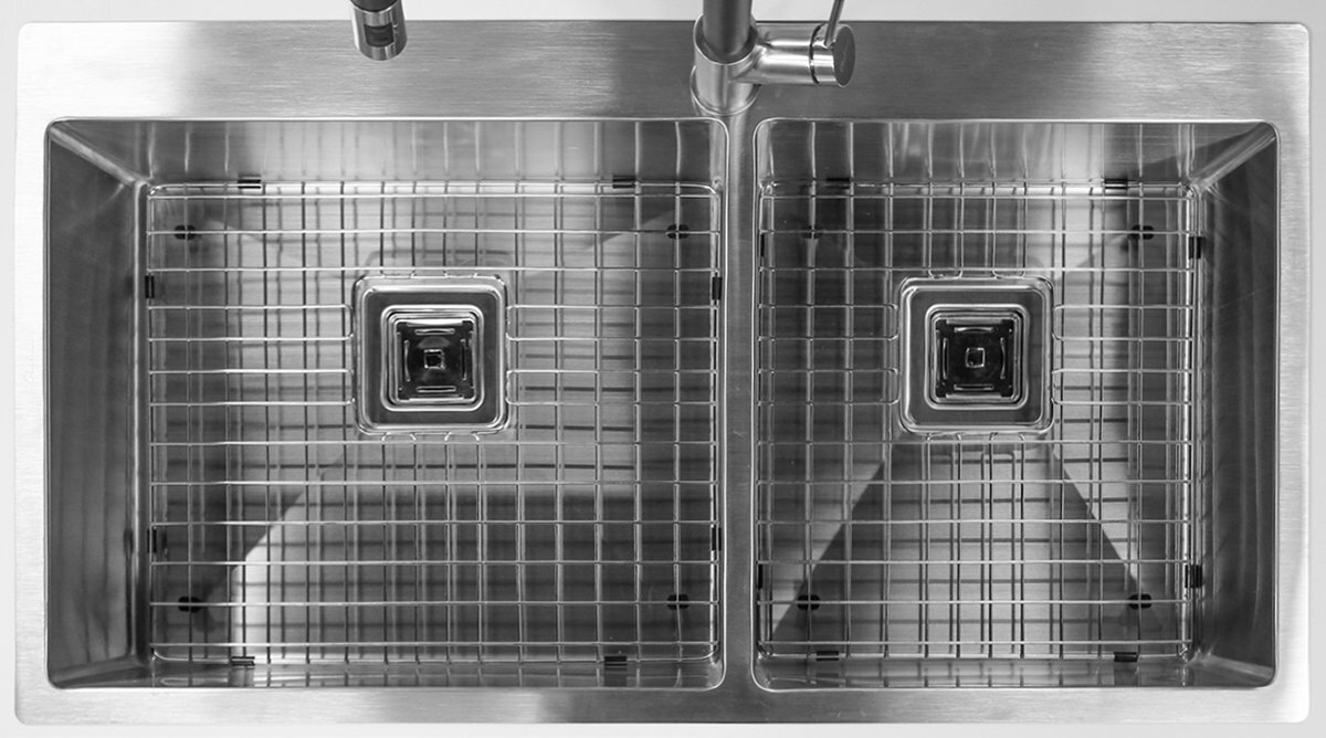 This sink would make a great statement piece in any modern kitchen. The square basket wastes will capture any solid food scraps in your bowl and, although the bowls are square by design, their soft radius corners make for easy cleaning.