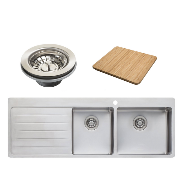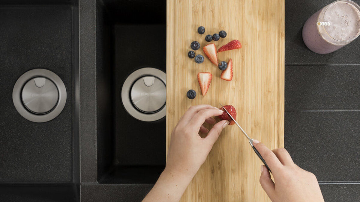 This sink comes with a large, sturdy chopping board for everyday food prep tasks. While you can rest this board on your benchtop, it can also be conveniently placed over the smaller sink bowl to make multitasking more achievable.