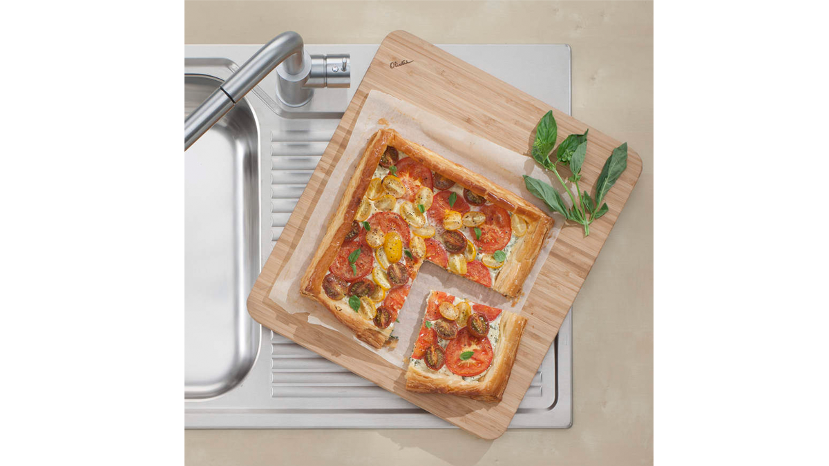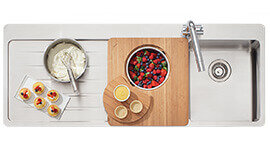 This sink comes with a large, sturdy chopping board for everyday food prep tasks. While you can rest this board on your benchtop, it can also be conveniently placed over the smaller sink bowl to make multitasking more achievable.