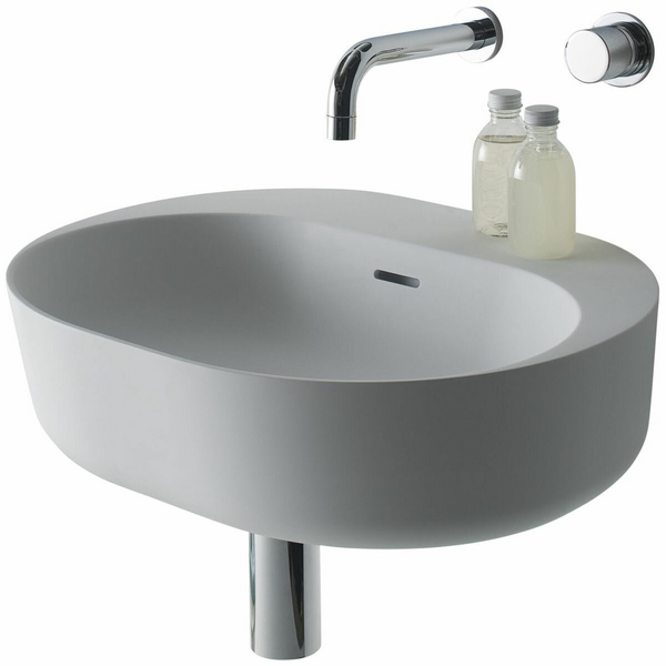 The Omvivo Lilli 500 basin with its smooth curves is a sophisticated piece for a modern bathroom design and is particularly suited to small bathrooms. Manufactured in Solid Surface it has a smooth matt finish that is durable and easy to maintain. Lilli 500 can be wall mounted as well as installed onto a bench top. This model comes without a tap hole and is supplied with a polished chrome pop up plug and waste and wall basin fixing bolts.
