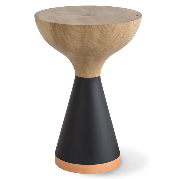 | Craftsmanship | The quality of the materials and craft must be high to manage the perils of cross grain production. The solidity of the top contrasts with the smooth perfection of the stained base, a demanding aspect of production, particularly at the line where the 2 sections meet. The workshop in Gloucestershire turns a Float table in 3 parts. They are hand stained and finished in the Pinch studio, and tethered together with patinated brass dials and rods. |