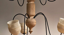 At the chandelier’s core is a sculptural oak centrepiece that acts as an anchor of natural warmth from which gracefully curved bronze stems extend outward. Each stem is crowned with a delicately moulded abaca fibre shade, subtly echoing the place candles once held. The contrast between the organic fibre, the rich timber, and the metal detailing offers a rich sensory experience that deepens as the light diffuses through the shades and casts intricate shadows across the space.