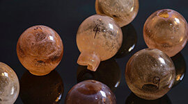 Each spherical shade is glass-blown at a specialist London workshop using traditional techniques. Layers of tinted and clear glass are rolled, shaped and cooled to form a mottled inner texture, capturing the fluid choreography of glassblowing in a moment that feels both dynamic and serene.