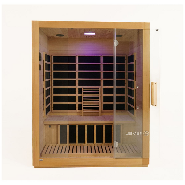 With its intuitive digital control panel, users can easily adjust temperature and session length to suit their preferences. Thoughtful details like the tempered glass door, ergonomic bench seating, and whisper-quiet operation complete a premium relaxation experience. The Revel Kora 3-person sauna invites you to unwind, recharge, and elevate your home with wellness-focused sophistication.