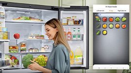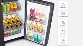 The CoolSelect+ Flex Zone is a game-changer for keeping foods and drinks at their best. Situated in the bottom right freezer, this feature offers five preset temperature modes tailored to various items, ensuring optimal freshness and taste retention. Whether it's freezing items at a standard temperature or softly freezing delicate foods, maintaining meats and fish at ideal chilling levels, keeping fruits and veggies crisp, or chilling beverages to perfection, the CoolSelect+ Flex Zone provides precise control over storage conditions.